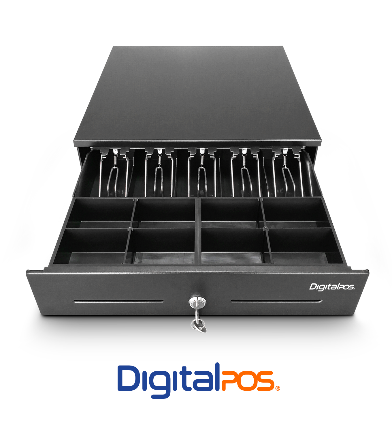 Cajón monedero de efectivo metálico para puntos de venta • Hecho de acero de gran calibre, adecuado para uso pesado y vida útil prolongada • Dimensiones Cajon: 410(W)x420(D)x100(H) mm • Dimensiones empaque: 468x458x140 (mm) • Diseño de bandeja: 8 puestos de monedas / 5 de billetes con clip metálicos • Riel plastico ABS resistente de alta duración • Ciclo de vida: MTBF 1,000,000 aperturas + • Interfaz: RJ12 para impresora estandar EPSON • Micro switch incluido • Bandeja de monedas extraíbles • 2 Ranura de medios dentro de la bandeja de monedas • 1 año de garantía • Peso: 5.6kg.
